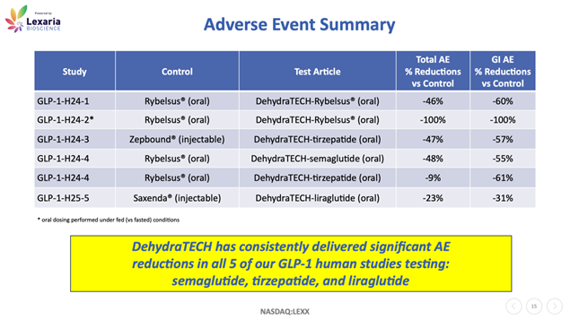 The company has completed five human studies to date, evaluating DehydraTECH with leading GLP-1 compounds like semaglutide (marketed as Ozempic® and Wegovy®, tirzepatide (Mounjaro® and Zepbound®), and liraglutide (Saxenda®). Company reported results have demonstrated consistent reductions in adverse gastrointestinal side effects (see table below).