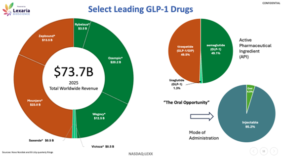 Lexaria’s pursuit of an oral delivery alternative adds another layer to its long-term potential. Today’s GLP-1 market—valued in the tens of billions globally—is still overwhelmingly dominated by injectable therapies, with oral options representing only a small fraction of total worldwide revenues (see chart below). To date, the most notable oral GLP-1 has been Rybelsus from Novo Nordisk, approved for type 2 diabetes. That leaves a significant opportunity for new oral formulations to make a major impact, as patient preference leans heavily towards pills over injections.